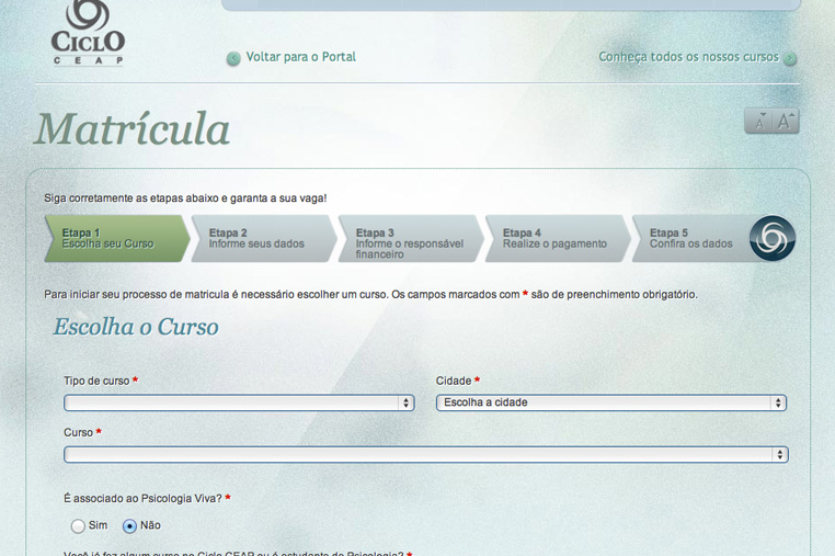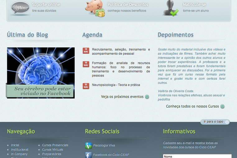 O Ciclo CEAP - Centro de Estudos Avançados em Psicologia, oferece uma sólida formação aos profissionais de psicologia e demais áreas que lidam com o comportamento humano e as relações interpessoais, ampliando suas possibilidades de atuação. Ministra cursos presenciais em cinco estados brasileiros e internacionalmente, contando com cursos à distância, preparatórios para concursos e vídeo aulas. O projeto da Ciclo CEAP contou com o desenvolvimento do portal, intranet, EAD com customização de Moodle, Blog, Facebook e Twitter.