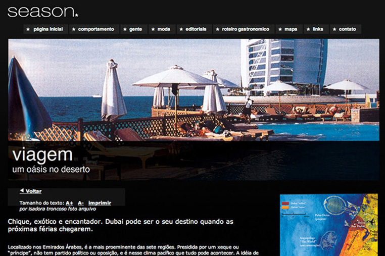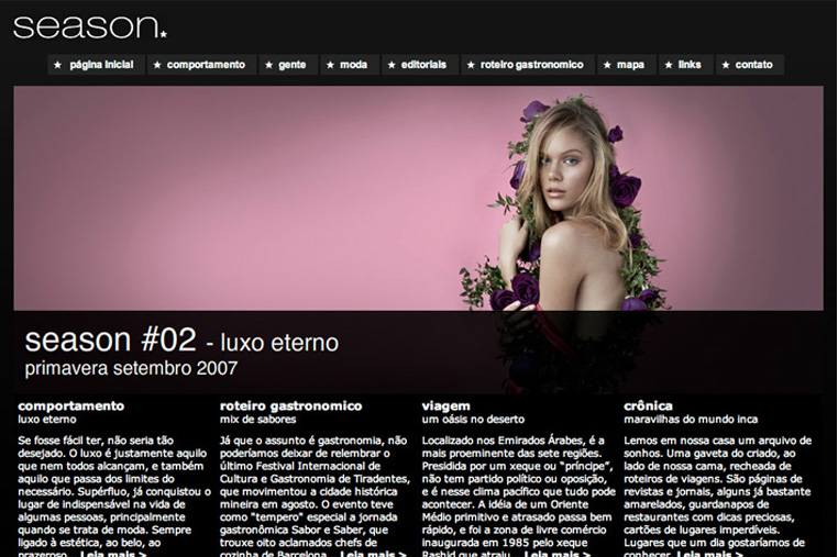 Projeto desenvolvido em 2007 na Voice Design. A revista Season é uma referência em Belo Horizonte: comportamento, entrevistas, moda, viagens e gastronomia. Neste projeto o conceito principal era o luxo e sofisticação aliadas a uma fácil navegação e uma boa experiência do usuário.