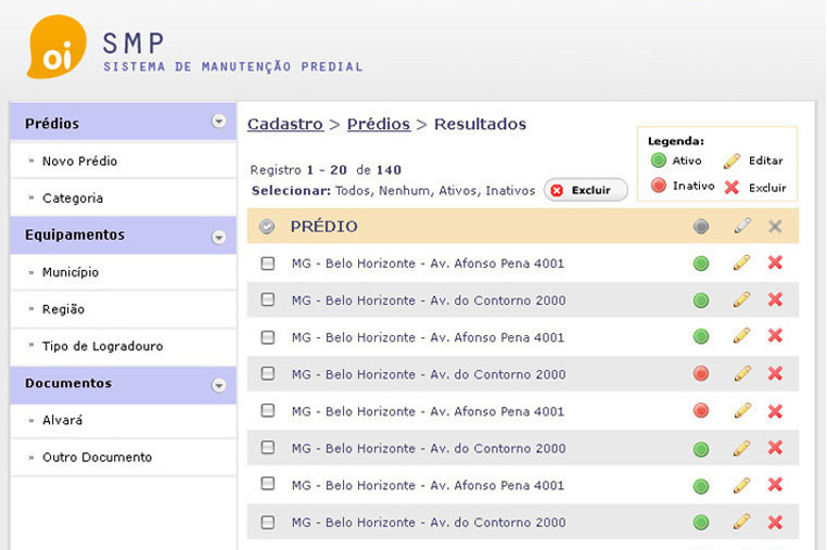 Projeto desenvolvido na Intensiva Comunicação e Design em 2008. O sistema Oi SMP tinha como objetivo integrar o controle de manutenção predial e infraestrutura de toda rede da Oi no Brasil. Neste projeto foi desenvolvido o fluxo de naveção e posteriormente o design da interface de forma a facilitar ao máximo o uso do sistema para o usuário.